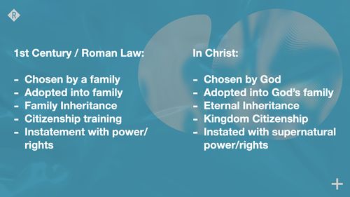 - What we see in Ephesians 1:3-6 is this - God, the one who is worthy of all praise, opened up heaven, blessed us, set his sights on a people, and acted in love by adopting us. The Greek word for adoption means “to place as a son within a family with full family privileges as an adult member of the family.” Check out the image below to see the parallels between the adoption process at the time Paul wrote the book of Ephesians and the biblical model of God adopting us as his sons and daughters. What stands out to you?